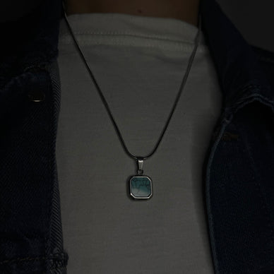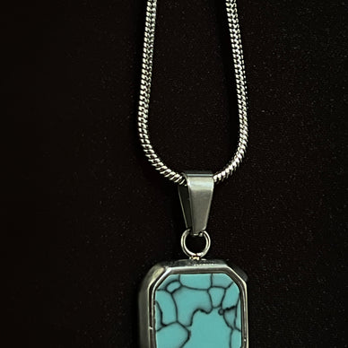 The Skyline Cipher is a statement piece defined by its striking contrasts and architectural precision. At its core is a vibrant, square-cut turquoise stone featuring a dramatic fractured matrix pattern—a mysterious "cipher" reminiscent of city grids or an electric current. This unique gemstone is securely set in a smooth, polished stainless steel (or sterling silver) bezel that emphasizes its clean, geometric edges. Suspended from a tightly woven, bright snake chain, this necklace combines minimalist form with maximum visual texture, making it an essential accessory for the individual who values modern design and subtle complexity.